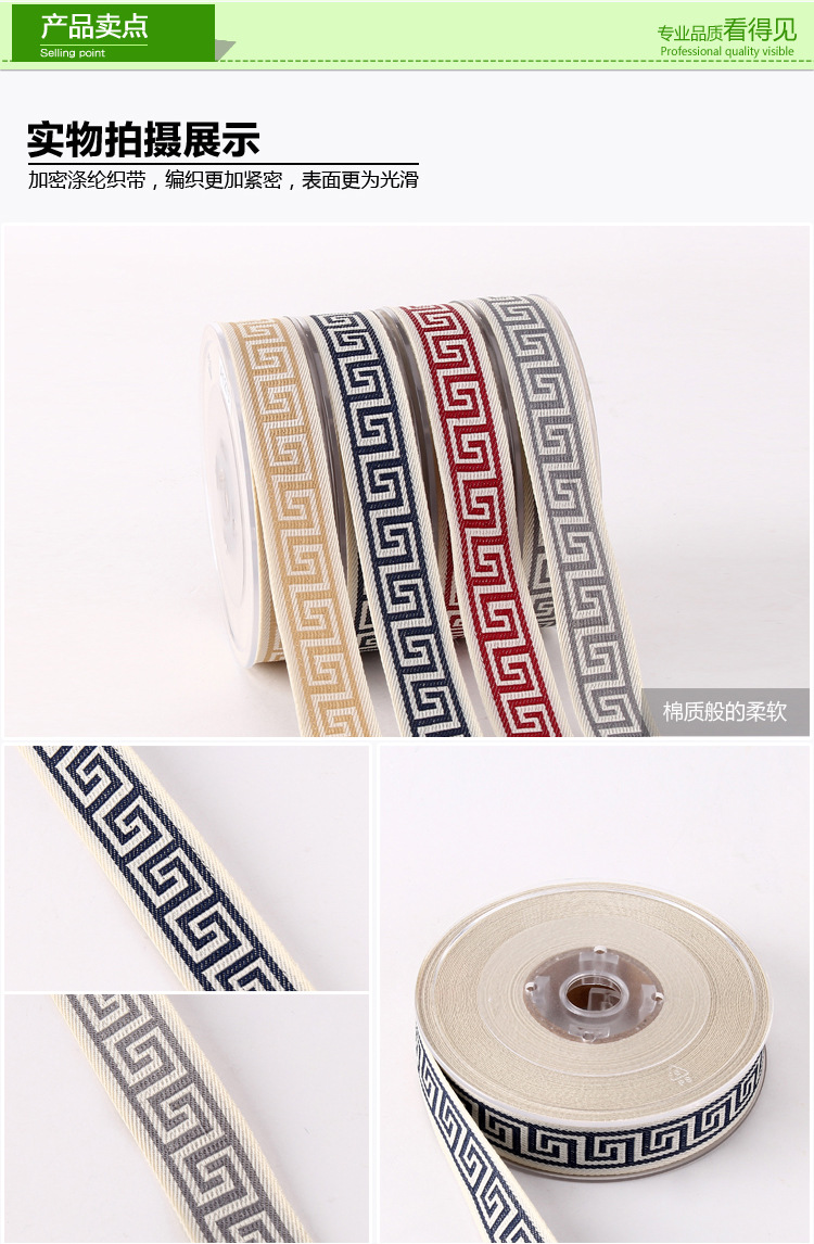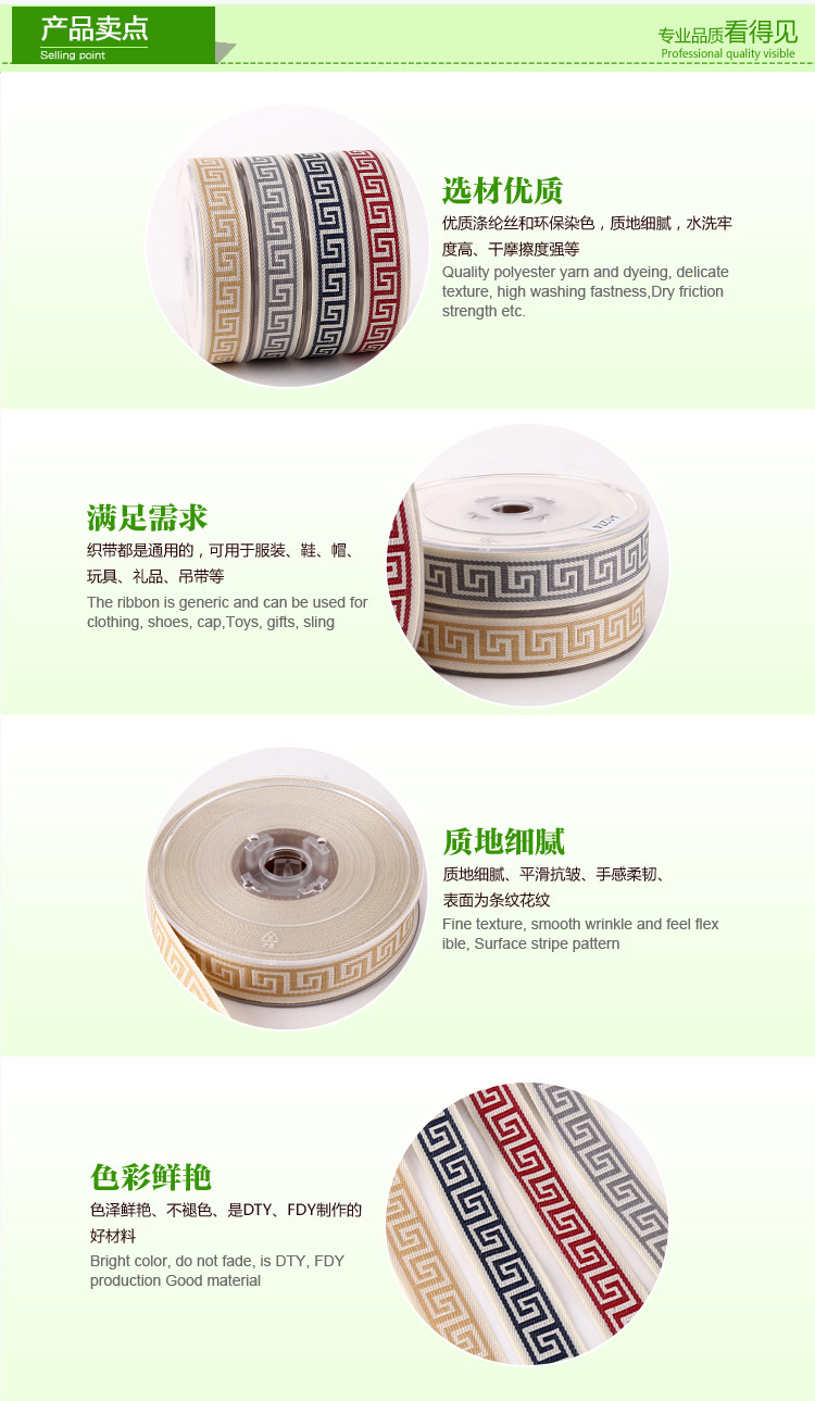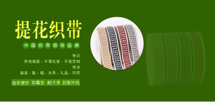 主營產(chǎn)品:提花織帶,韓國織帶,編織帶,仿尼龍織帶,緞帶/羅紋帶,子母織帶,熱轉(zhuǎn)印織帶,間色織帶