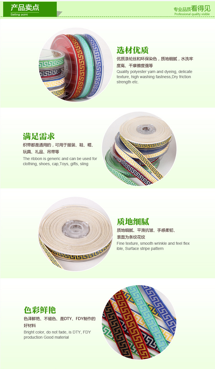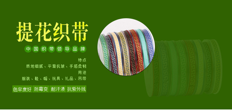 主營產(chǎn)品:提花織帶,韓國織帶,編織帶,仿尼龍織帶,緞帶/羅紋帶,子母織帶,熱轉(zhuǎn)印織帶,間色織帶