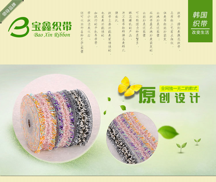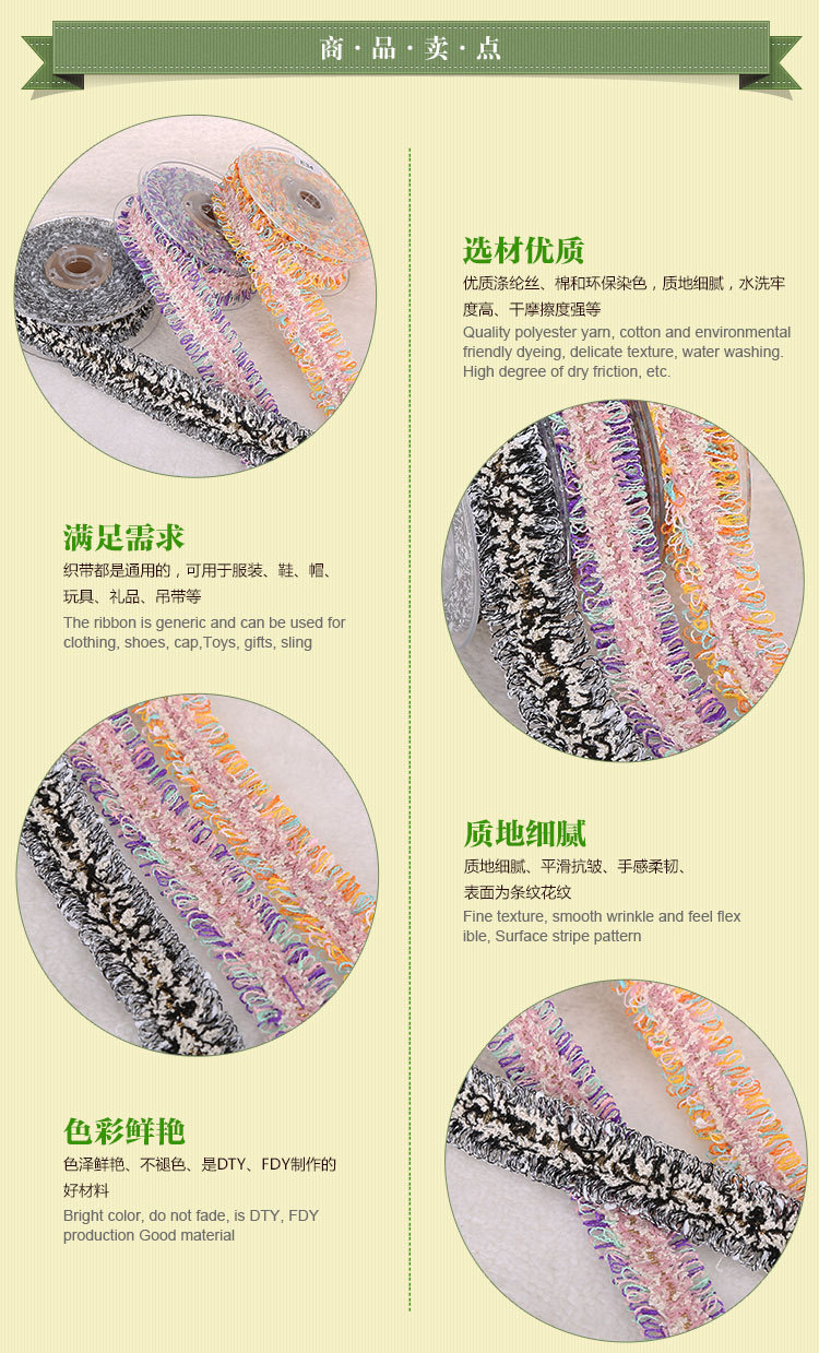 主營(yíng)產(chǎn)品:提花織帶,韓國(guó)織帶,編織帶,仿尼龍織帶,緞帶/羅紋帶,子母織帶,熱轉(zhuǎn)印織帶,間色織帶