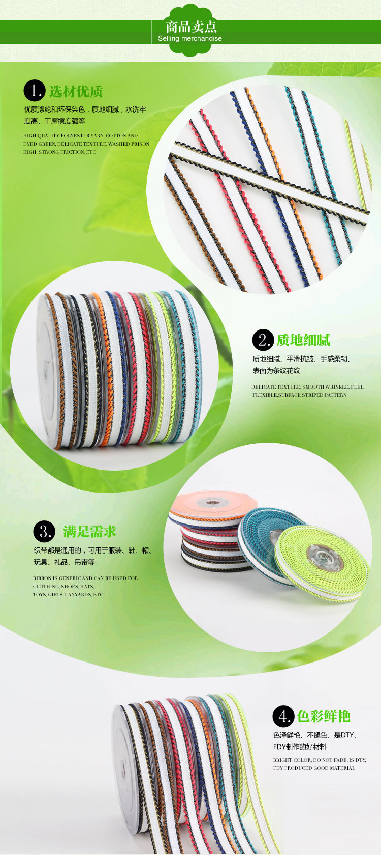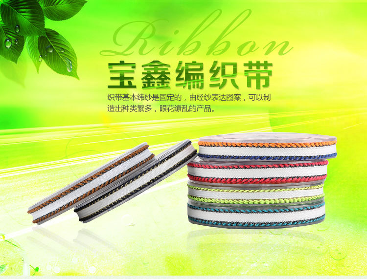 主營產(chǎn)品:提花織帶,韓國織帶,編織帶,仿尼龍織帶,緞帶/羅紋帶,子母織帶,熱轉(zhuǎn)印織帶,間色織帶